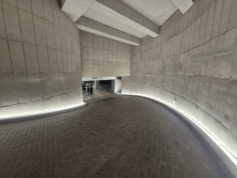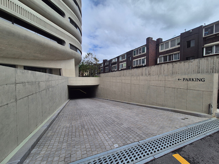 주차장은 종종 기능만을 위한 공간으로 여겨지지만, 이런 공간에서는 디테일이 건축의 태도를 말해준다. 곡선을 그리며 이어지는 경사로는 차를 이용하는 고객들에게는 건물의 첫인상이다. 브랜드의 이미지는 차가 입구에 내려앉는 순간부터 고객의 무의식에 새겨진다.